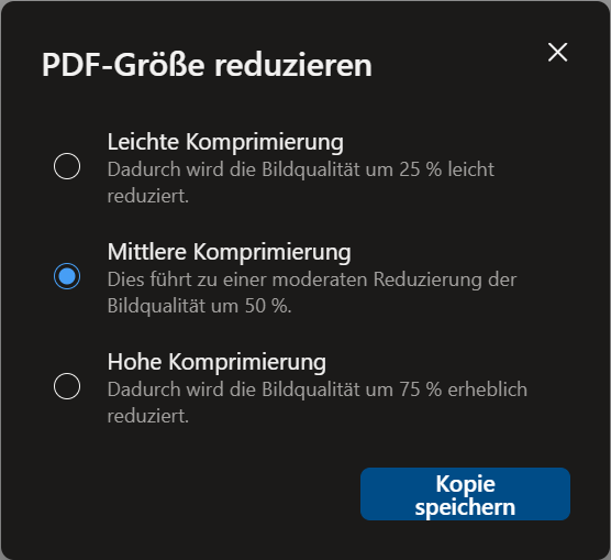 Beim Speichern einer PDF-Datei in SharePoint Online steht nun die Option „PDF-Größe reduzieren“ zur Verfügung. Nutzer:innen können dabei zwischen drei Komprimierungsstufen wählen:
